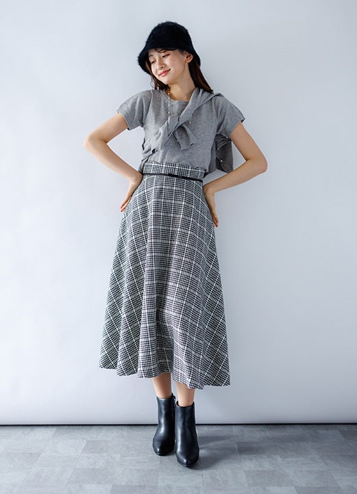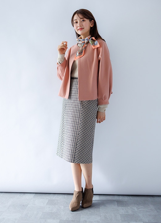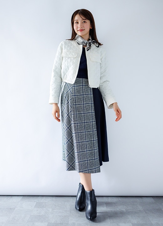 明るく元気さ漂う親しみチェック柄スカートの女子アナコーデ -