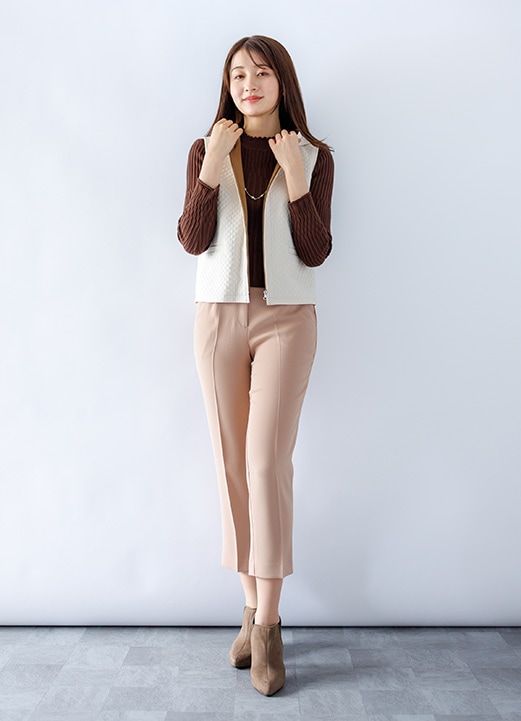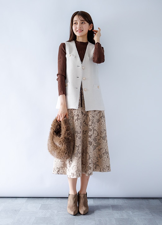 秋冬トレンドの華やぎジレでリッチ感が上がるキャリア系女子アナコーデ -