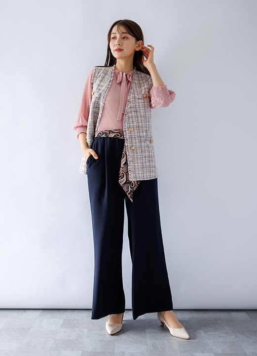優雅さを醸しつつシャキッと背筋の伸びるキャスター風ジレコーデ -