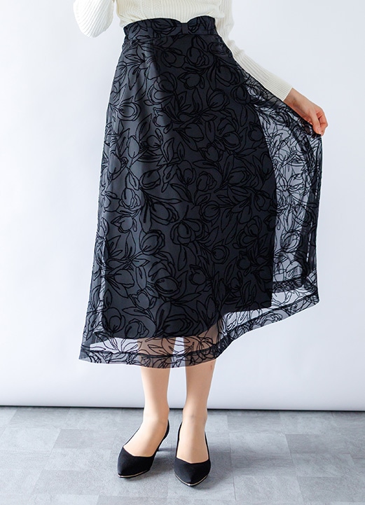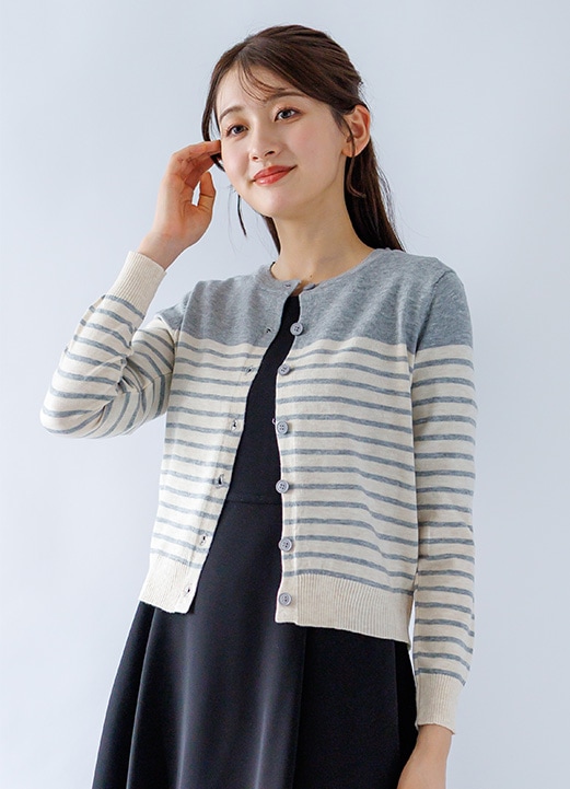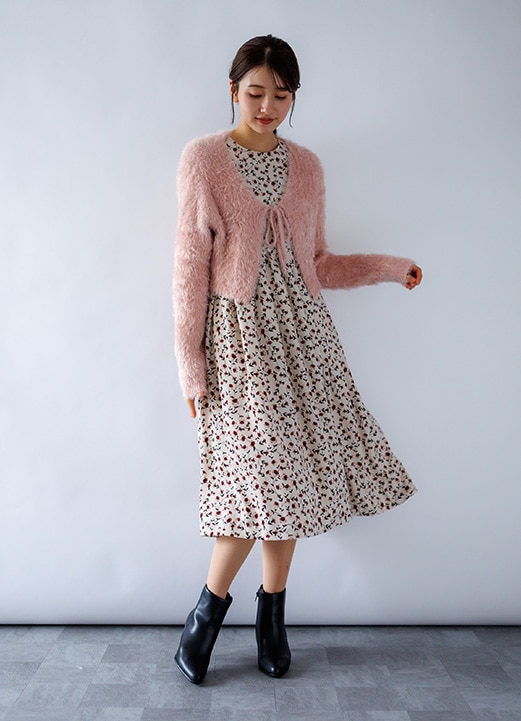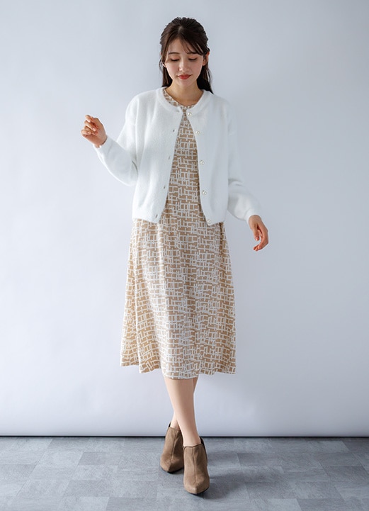 優しい大人プリントと落着きカーデで清楚感漂う女子アナ風コーデ -