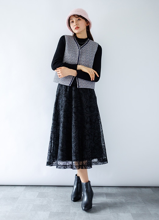 通勤にも使える!華やぎスカート×ジレの華やかキャリア系女子アナ風コーデ -